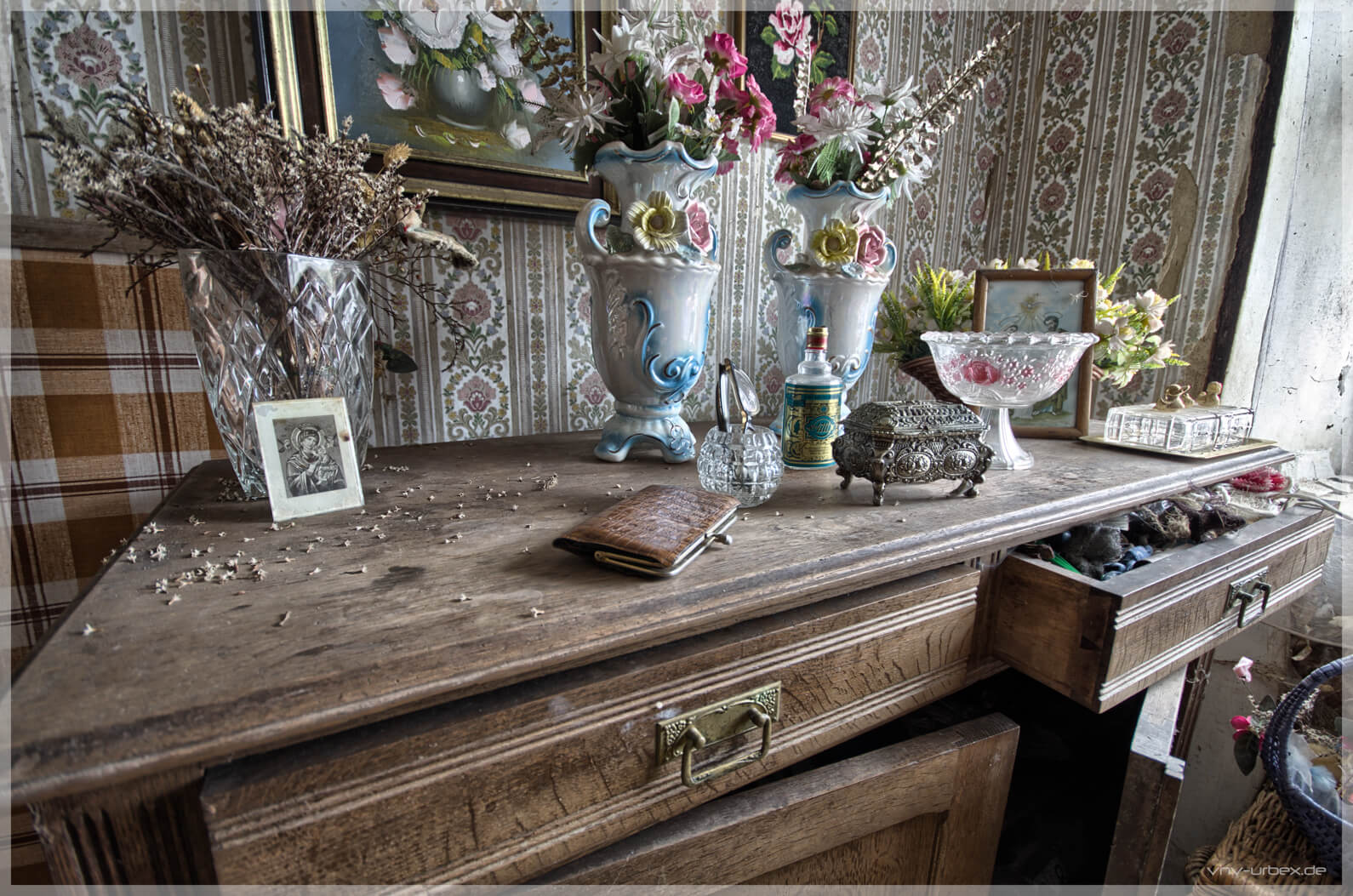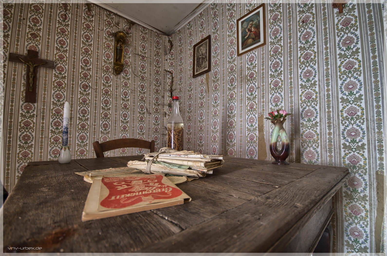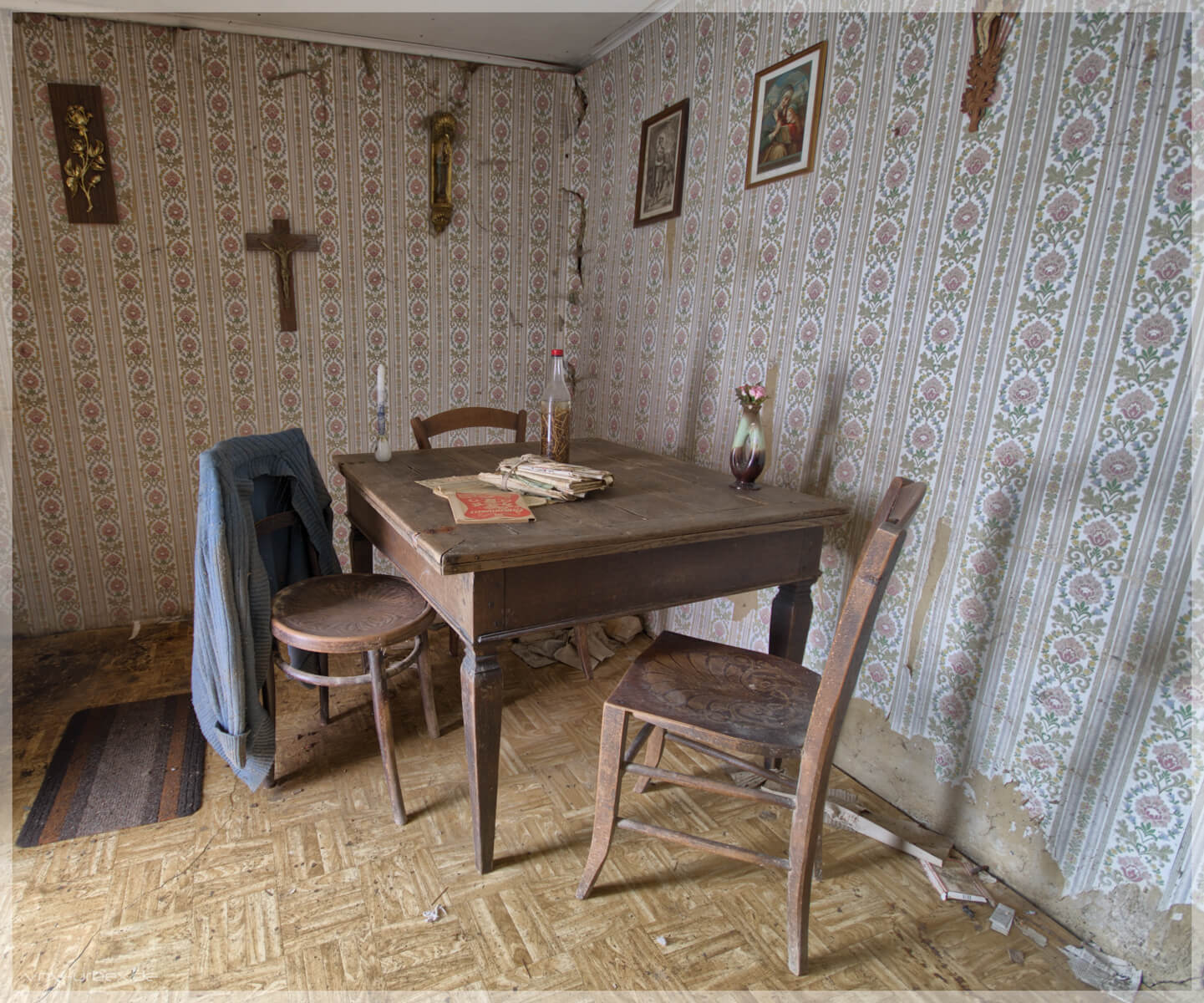 Maison Anna ist ein kleines verlassenes Wohnhaus, am Rande eines Dorfs im Norden von Luxemburg. Scheinbar lebte hier zum Schluss, eine Frau die sehr gläubig gewesen sein muss. Von außen ist es nur ein unscheinbares Haus, welches bereits einsturzgefährdeten Eindruck macht und doch betritt man eine vergangene Welt. Eine andere Location in dem Dorf wurde leider schon abgerissen. Hoffen wir, dass es Maison Anna noch ein bisschen durch die Zeit schafft.