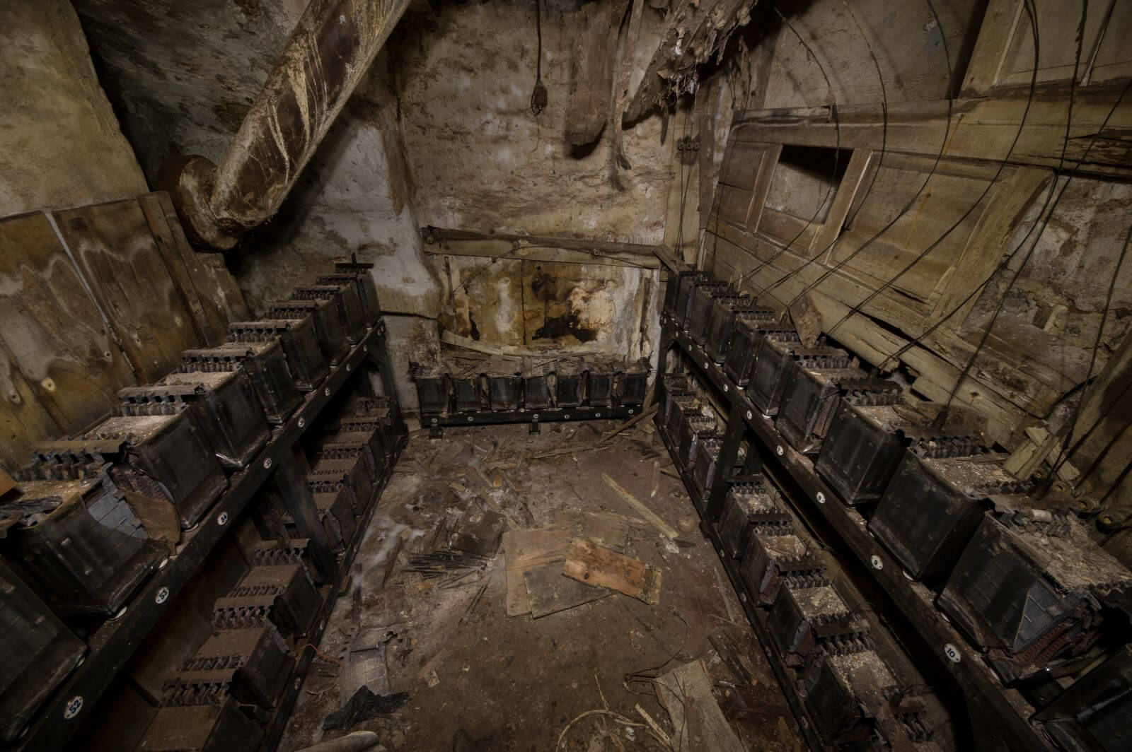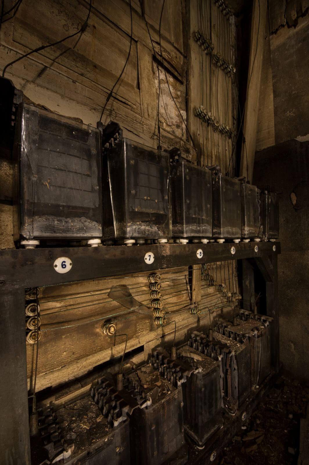 Es ist wirklich ein kleines Wunder, dass dieser Raum bis heute existiert. Die hochwertigen Hölzer der Regale halten noch immer die schweren Bleiakkumulatoren und die kleinen Emailleschilder zeigen die Batterienummer an. Metalldrähte umschlingen die kleinen Isolierglocken und verlaufen frei durch den Raum.