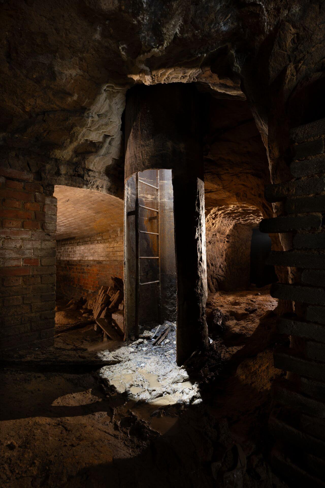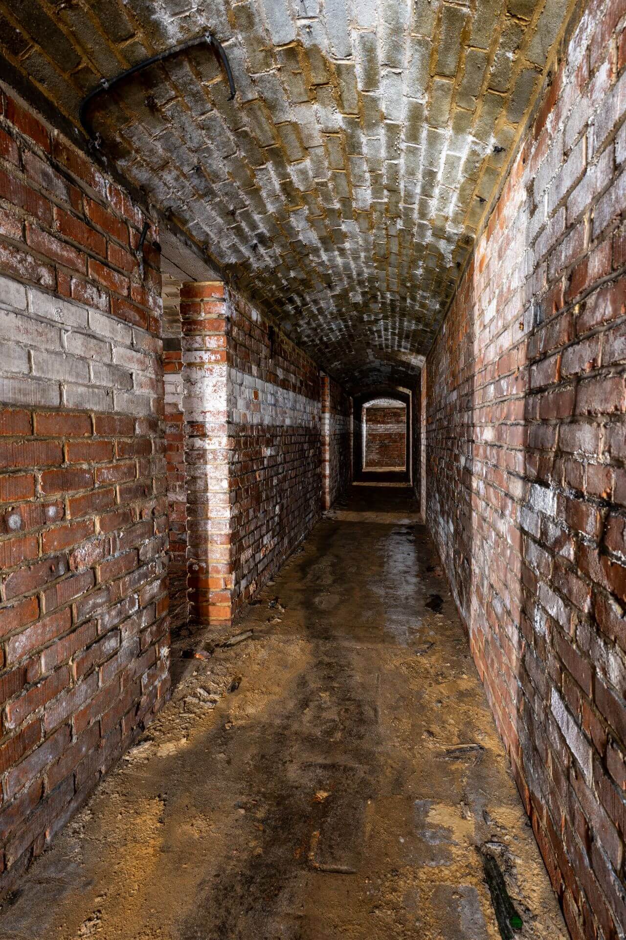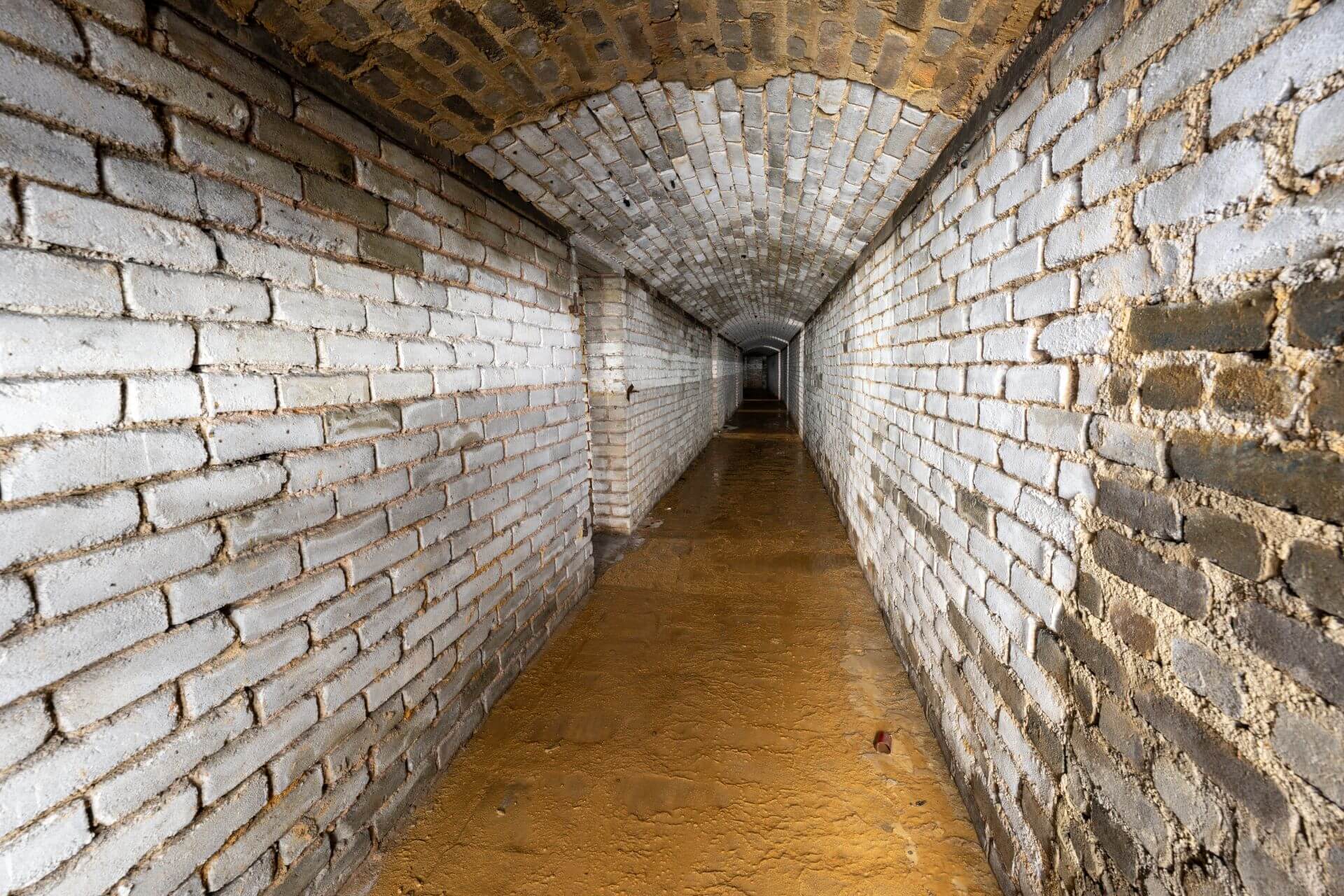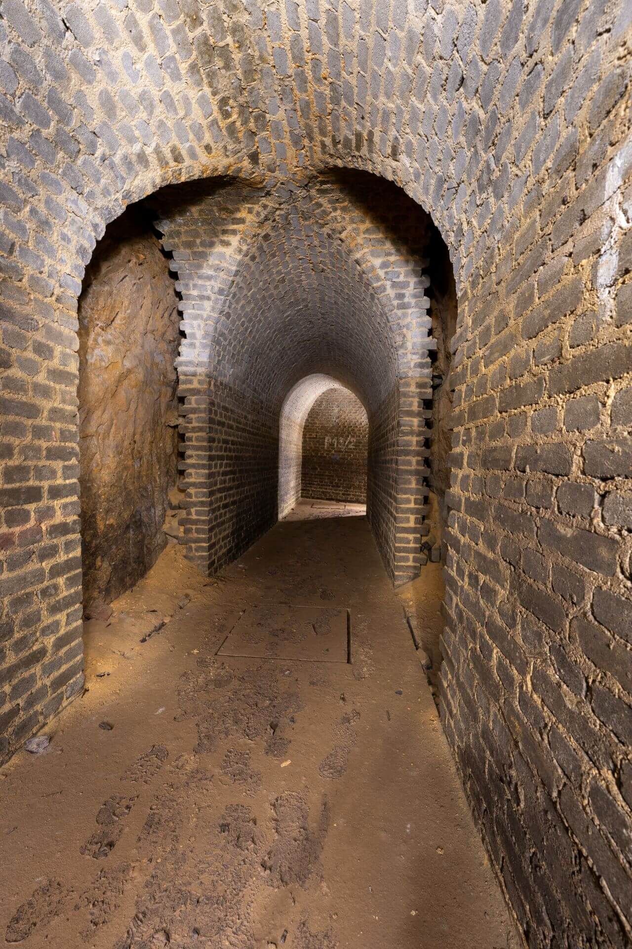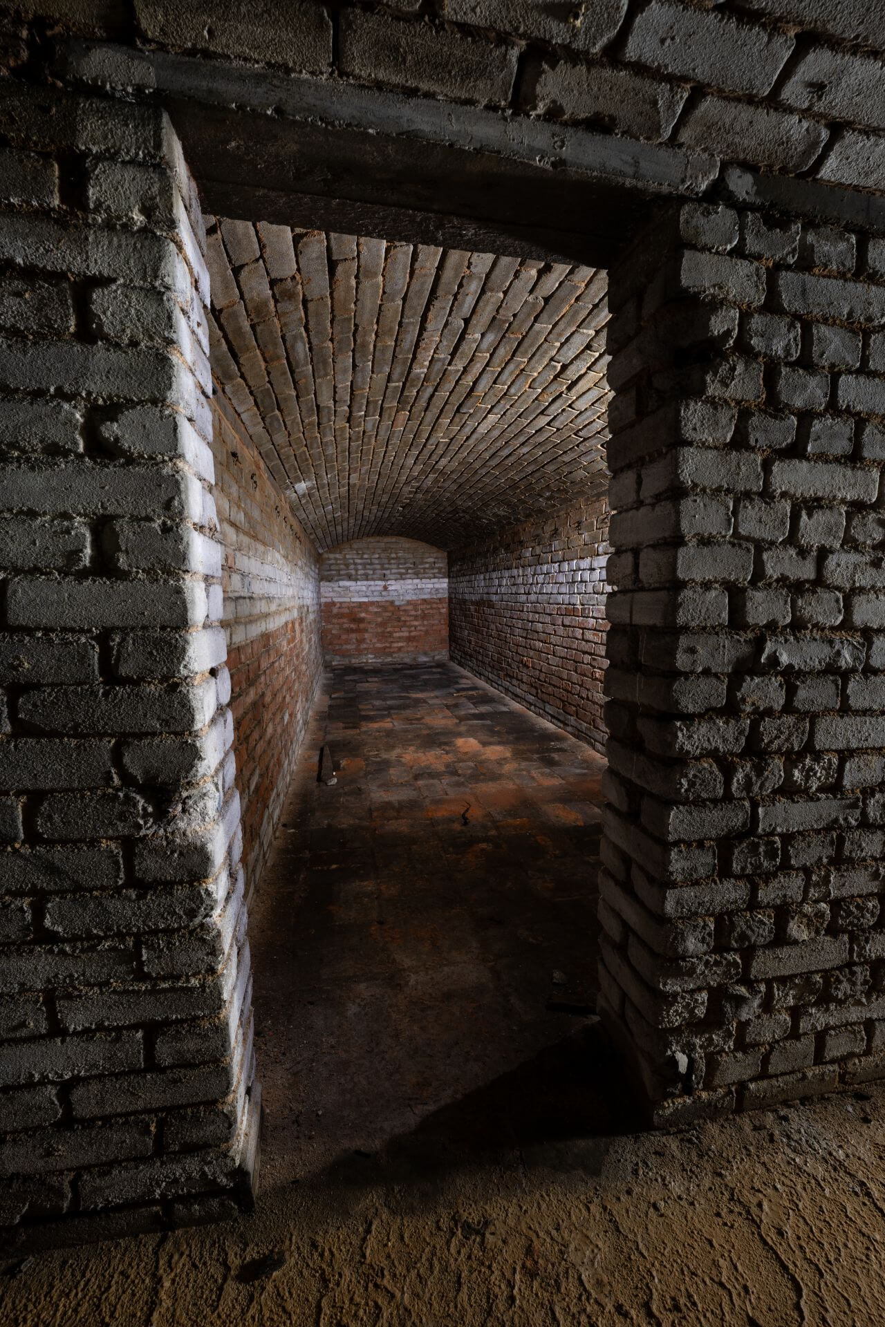 Flur im Luftschutzstollen Blau-Schwarz mit Ziegelausmauerung.