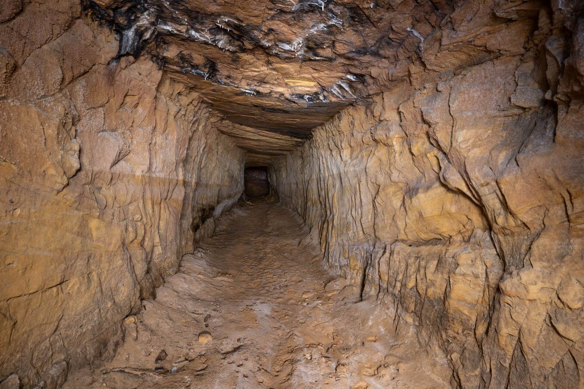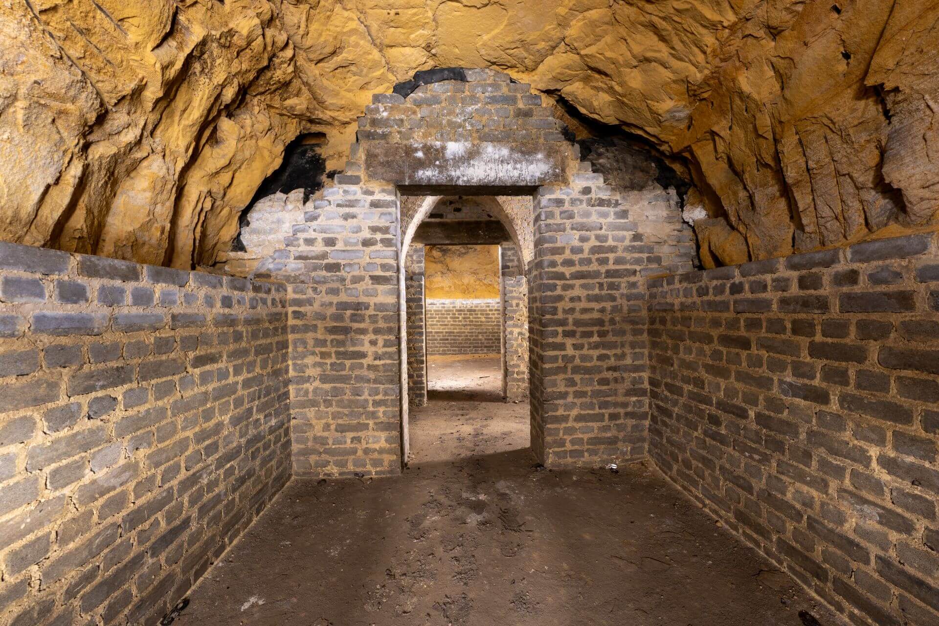 Zeigt das gemauerte Tonnengewölbe, rundherum ist der nackte Fels zu sehen.