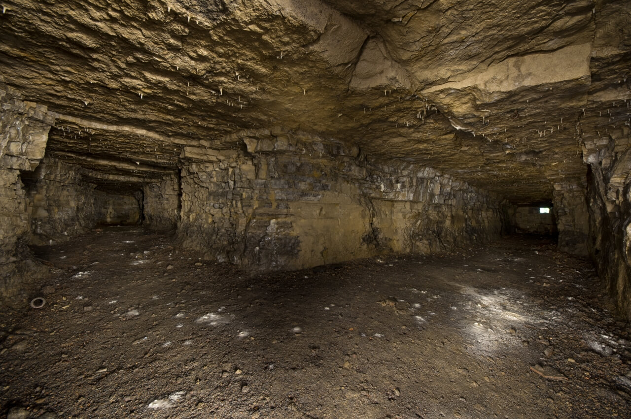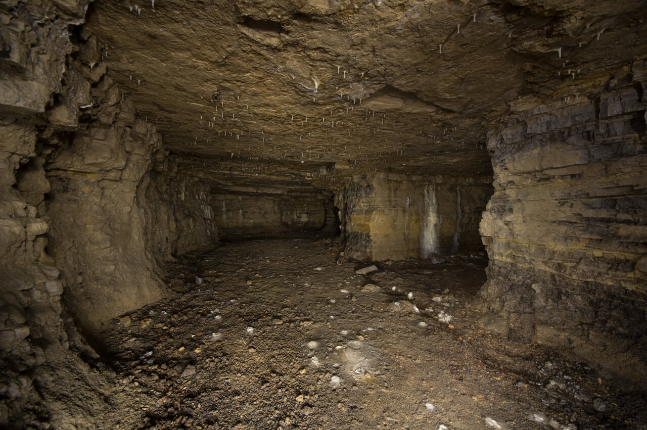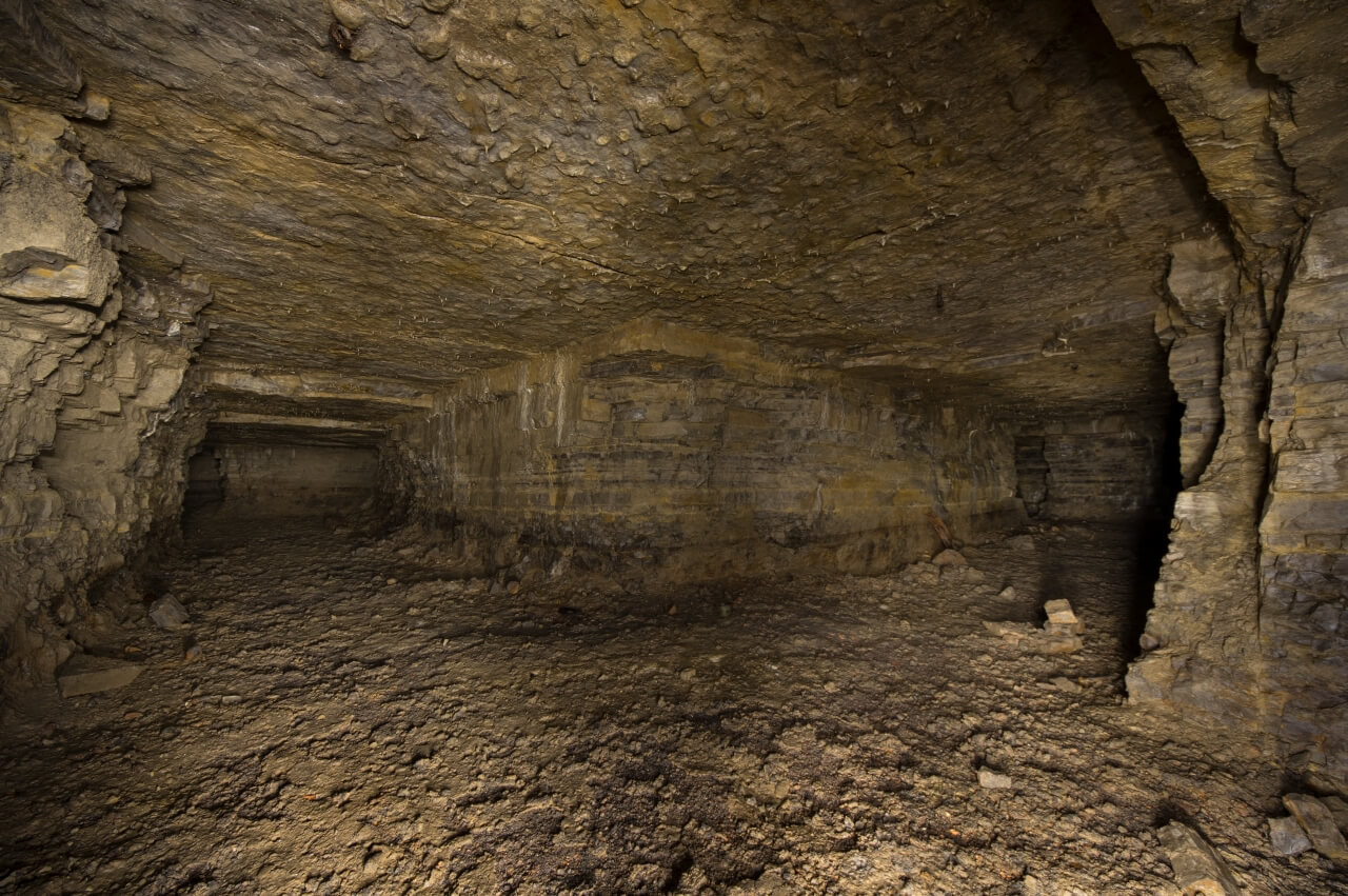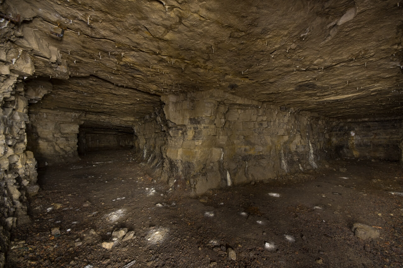 Manche Perspektiven erinnerten mich an einen Kammerpfeilerbau, wie er im Bergbau betrieben wird. Dies ist zum Beispiel im Titelbild erkennbar. Insgesamt ist die Anlage sehr feucht, an vielen Stellen steht Wasser und die Sohle ist durchgehend schmierig. An den Stößen sind die einzelnen Schichtungen des Muschelkalks sichtbar und von der Firste wachsen kleine Stalaktiten.