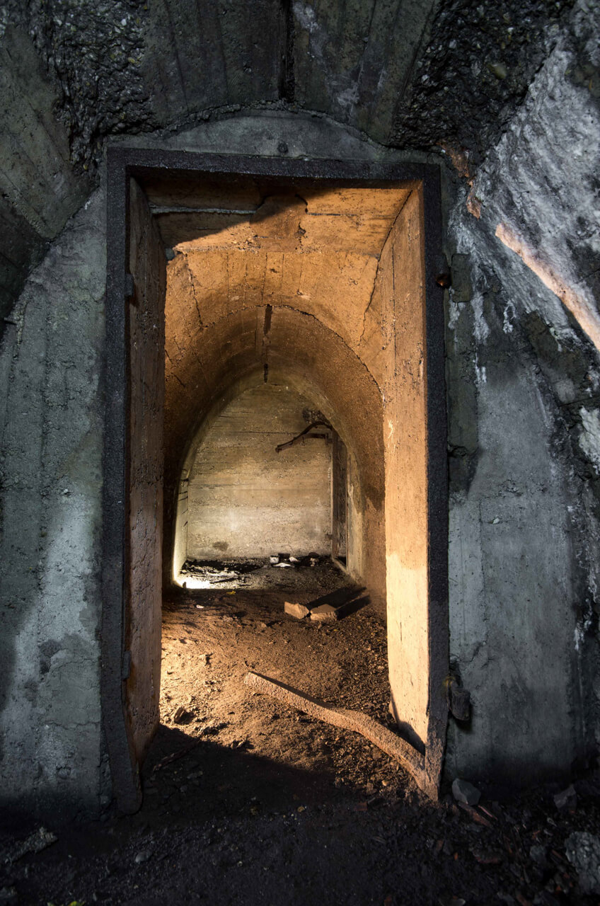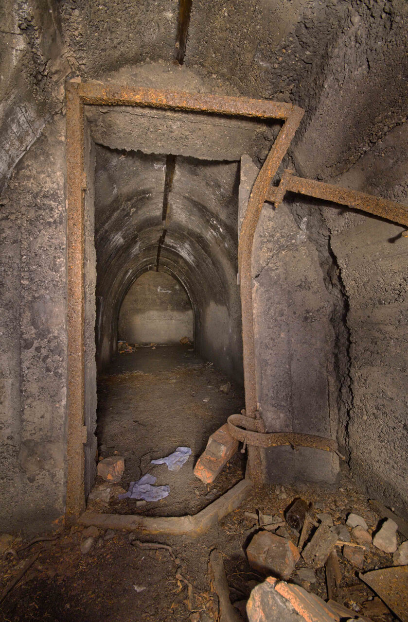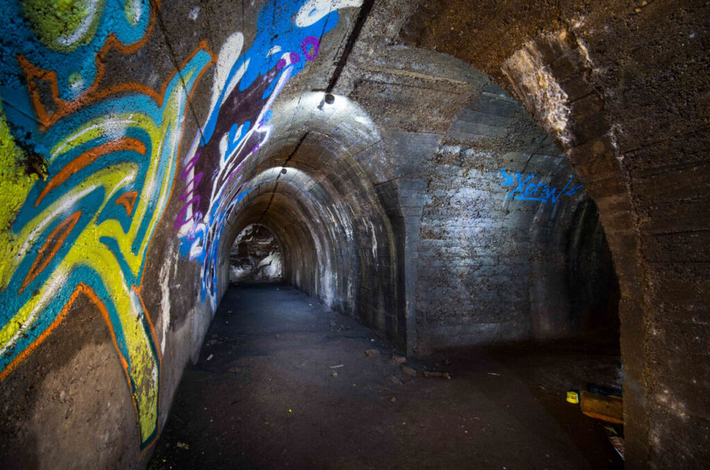 Hier ein Luftschutzstollen, der nur noch durch ein kleines verbrochenes Loch am Hang zu betreten ist, die Anlage ist nicht besonders groß und die Sprayer haben den Weg auch schon gefunden und gleich mal eine Wand als Leinwand genutzt. Die Anlage ist wie ein U angelegt, ca. 30 m lang und war einst über zwei Zugänge begehbar.