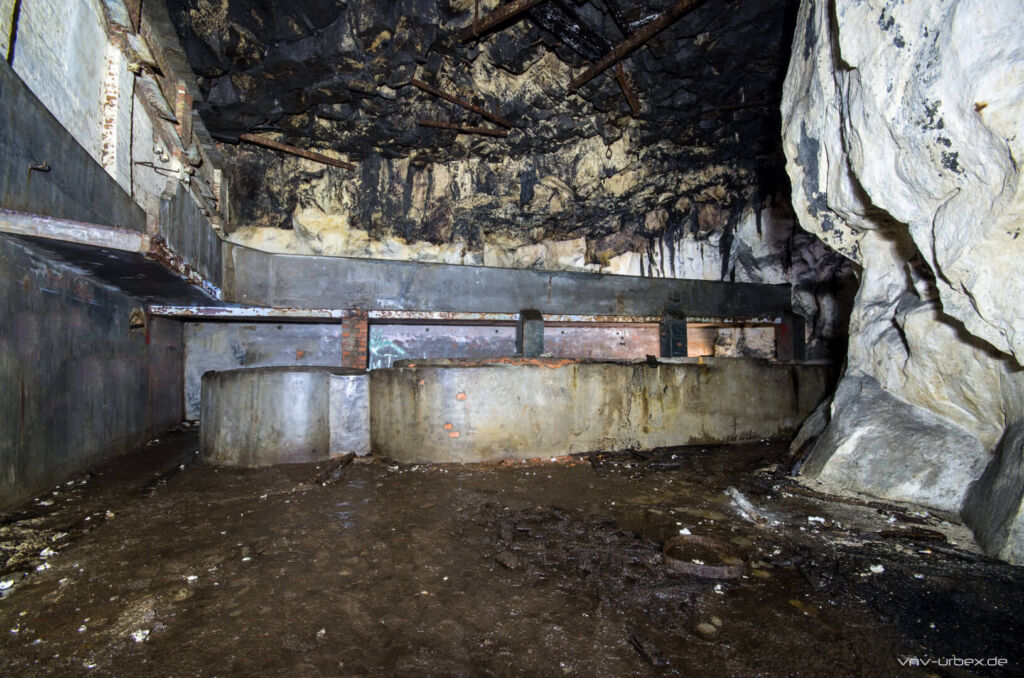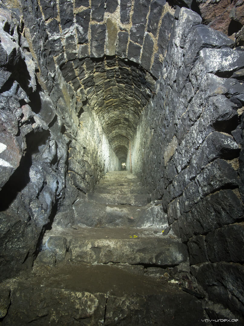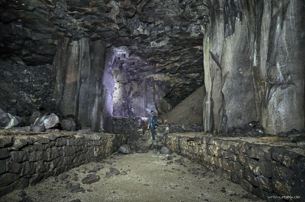 Eine gigantische Anlage und ein ganz besonderes Gestein, riesige Basaltsäulen die bei vulkanischen Aktivitäten entstanden sind. Man fühlt sich wirklich winzig neben diesen riesigen Säulen, die da so in den Abbauhallen stehen. Die Firste (Decken) haben etwas von einem Fisch, sie sehen irgendwie schuppig aus, so ganz anders als in bisher besuchten Bergwerken. Hier die Farben von einem Sandsteingebirge würden echt was hermachen. Die eigentliche U-Verlagerung, belegt nur einen kleinen Teil der Fläche, des ehemals größten Basaltbergwerks der Welt. Was aber erschreckend ist, sind die ganzen Schmierereien an den Wänden von Leuten, die sich den Weg nicht merken können. Auch der Müll ist ein Problem, er wird einfach unter Tage zurückgelassen und so vermüllt die Anlage immer mehr.