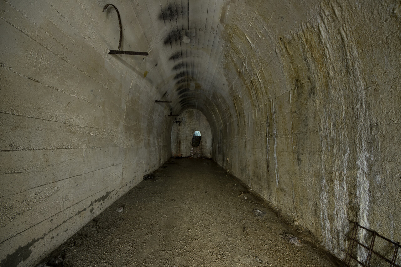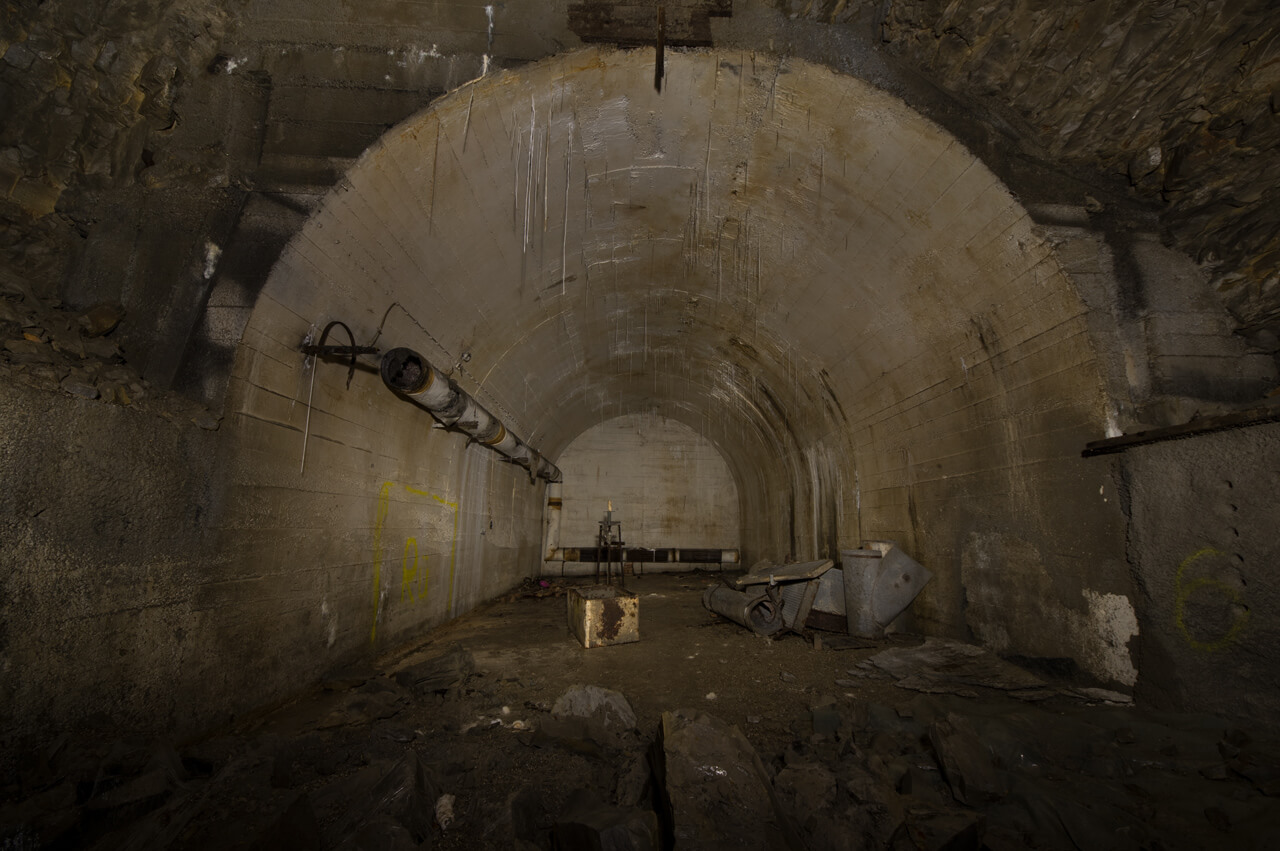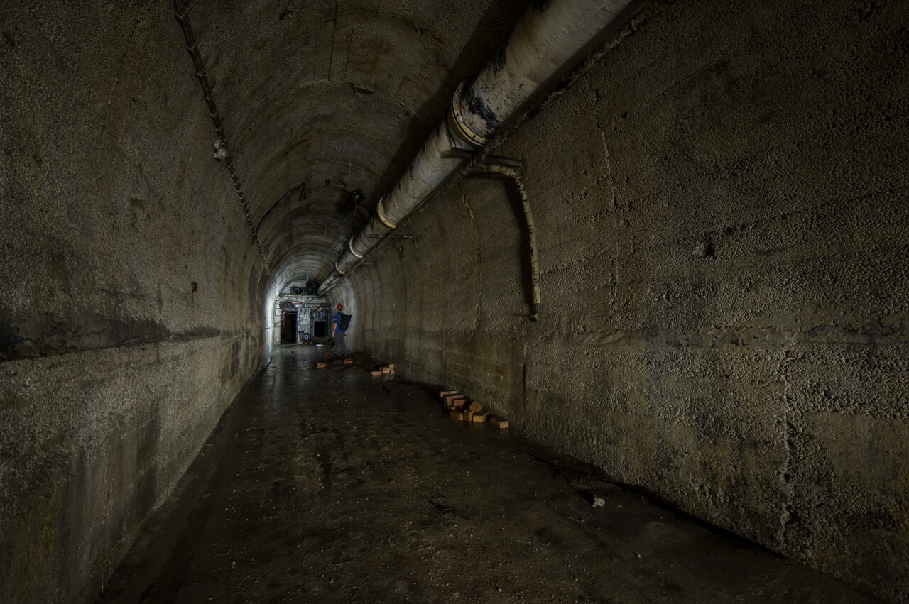 Ein wirklicher Augenschmaus ist der Zugangsstollen, mit seinem gradlinigen Betonausbau in ovaler Form. Man betritt diesen im ersten ausgebauten Teil und kommt nach 15m an eine Tür und kann in den fast 45m langen Stollen schauen. Seine Form und länge vermittelt den Eindruck von Unendlichkeit. Auch der originale Lüftungsschacht ist noch vorhanden und führt bis zur ersten großen Räumlichkeit. Teile der Lüftung im Zugangsbereich wurden aber nachträglich eingebaut und müssen der Champignonfarm gedient haben.