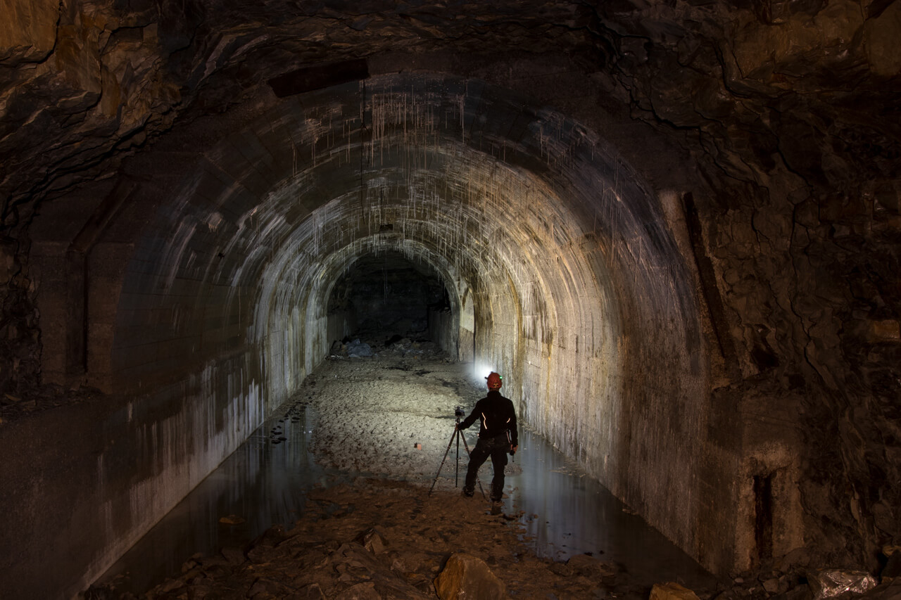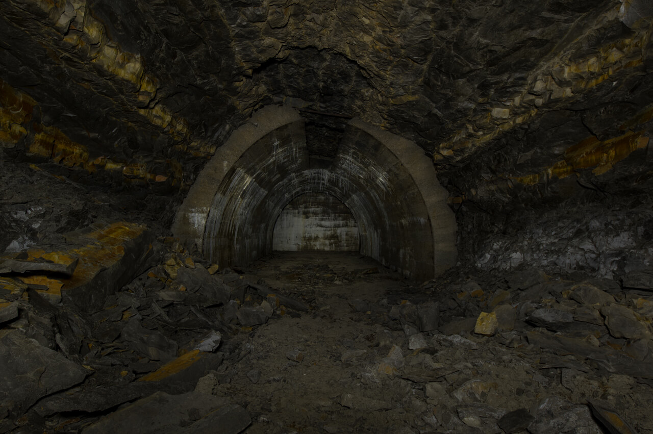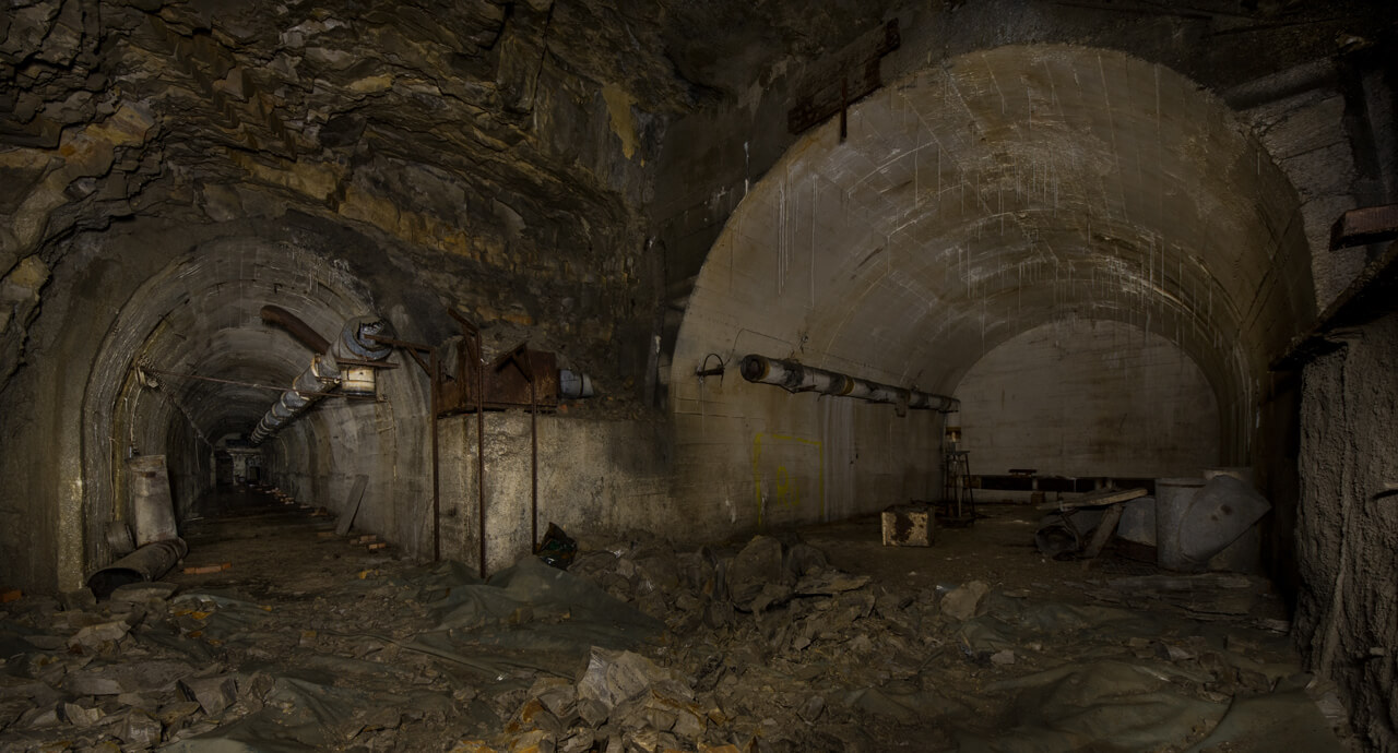 Die U-Verlagerung liegt auf einer Fläche von circa 180m x120m, der Zugangsstollen ist bis auf einen kleinen Kreuzungsabschnitt voll ausgebaut und hat eine Länge von circa 80m. Diese Strecke ist 3m breit und circa 3,80m hoch. Es finden sich noch einige Teile der Elektroinstallation und der Lüftungsanlage. Die Lüftungsanlage wurde aber nur im Zugangsstollen installiert und reicht circa 65m in die Anlage. Der hintere Teil der Anlage glänzt dann mit größere Stollenquerschnitte, die ausgebauten Strecken sind 6m breit und weisen eine Höhe von knapp 5m auf. Ich denke, hier sollte die Betriebsstätte der U- Verlagerung eingerichtet werden. Insgesamt wurde nur circa 1/4 der Stollen ausgebaut und gegen Verbruch gesichert, auf den restlichen Strecken herrscht das absolute Chaos.