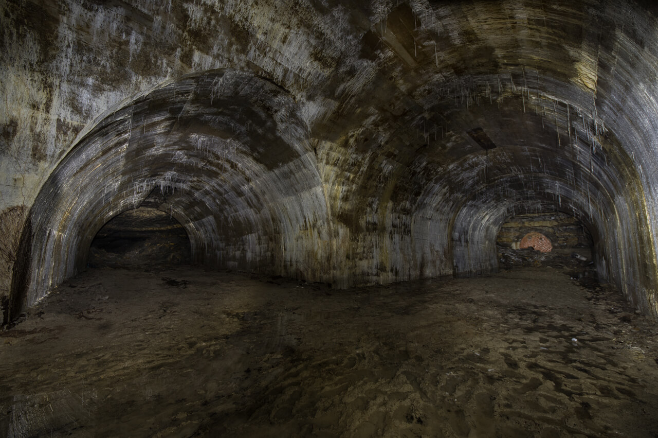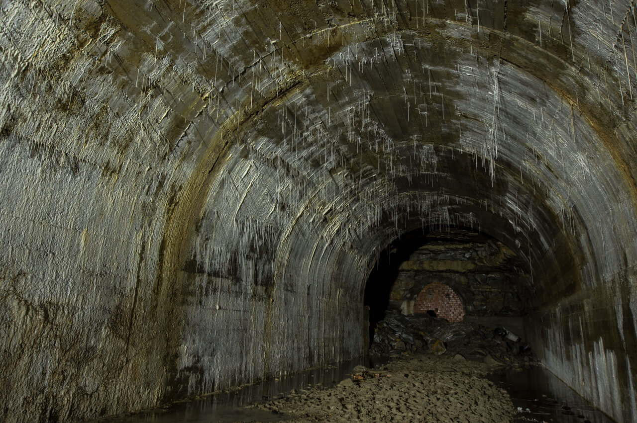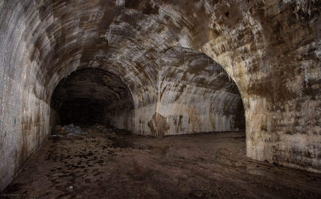 Im hinteren Teil der U-Verlagerung sind dann die Räumlichkeiten wesentlich größer, die Stollen Breite(6m) und Höhe(5m) wirken wirklich imposant auf den Befahrer. Ein großer schallender Raum, der sich im Taschenlampenschein erhebt. Tropfsteine hängen von der Decke und das Wasser läuft an ihnen herab, sammelt sich an der Spitze und fällt schließlich in die Tiefe. Überall hört man tropfendes Wasser, besonders die vorhin erwähnten Folien verstärken diesen Effekt, wenn die Tropfen auf der Folie landen. Tropfsteine am Beton entstehen, wenn Calciumhydroxid aus dem Zement (Bestandteil von Beton) gelöst wird und dann mit dem Kohlendioxid in der Luft reagiert.